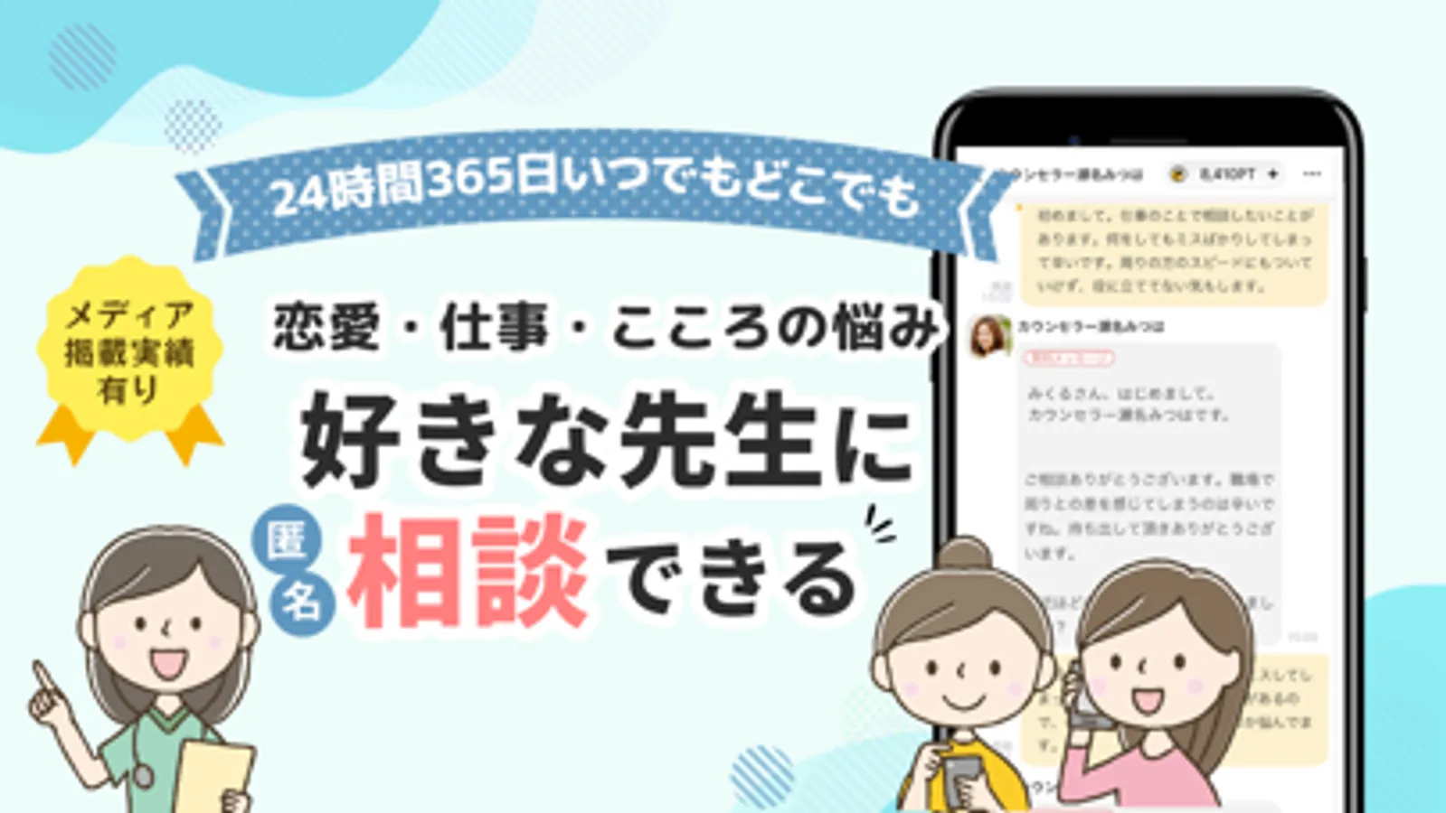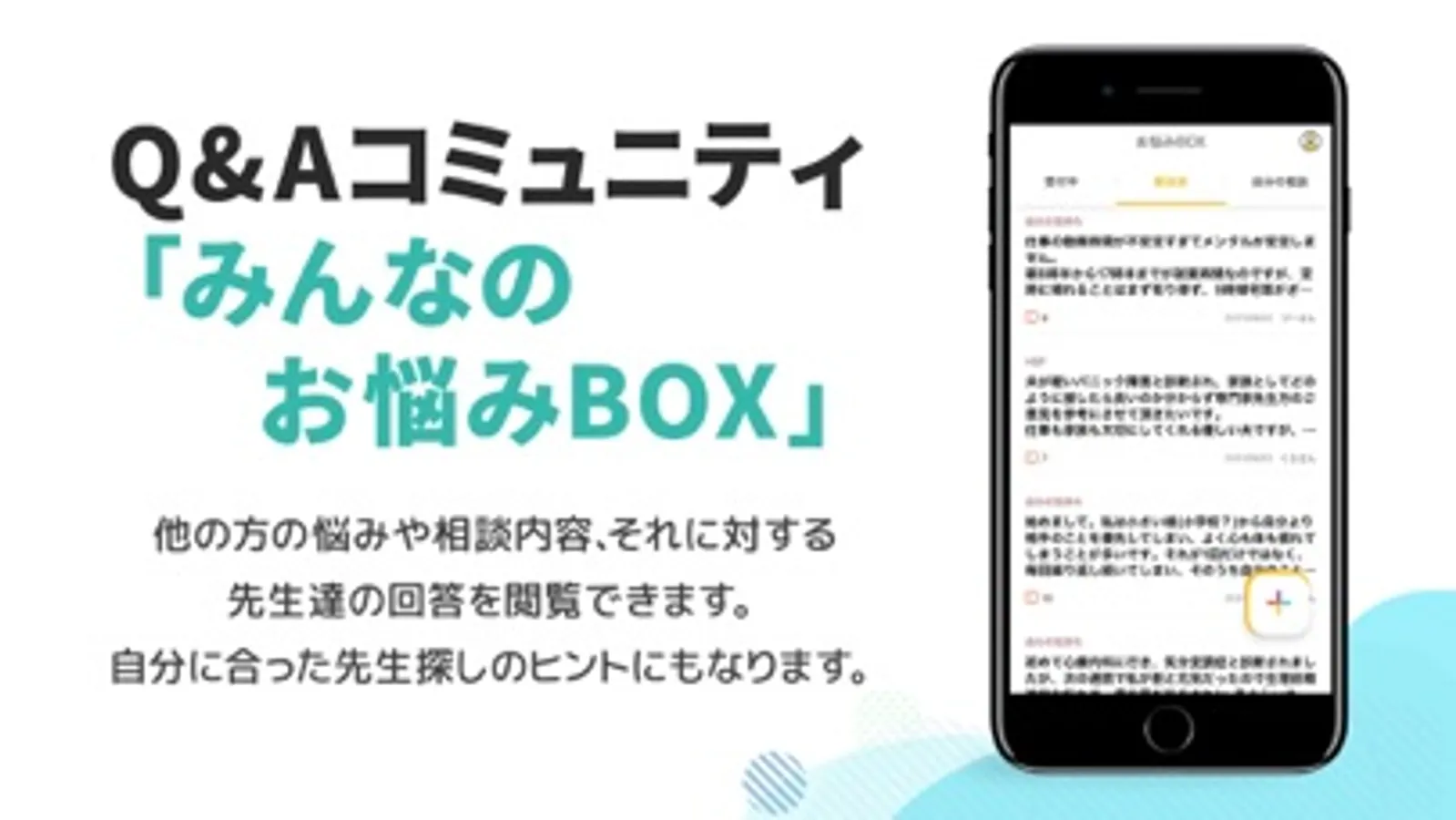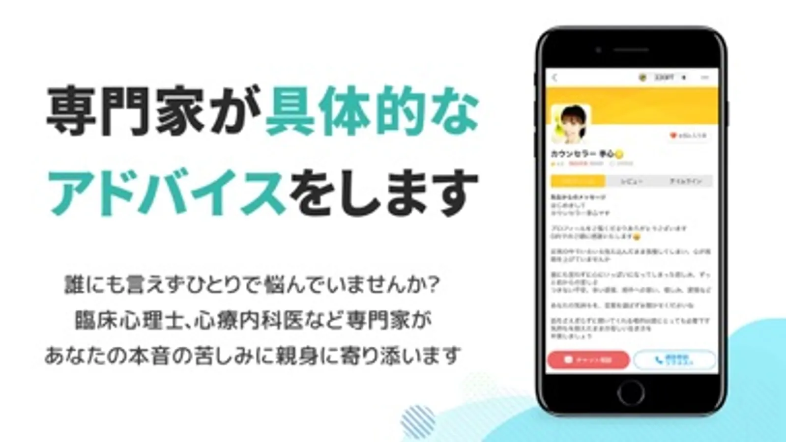日常生活や仕事、恋愛、家族、パートナー、子供、その他片付けや時間管理、自律神経の不調で生きづらさを感じていたり悩まれている方が、登録されている先生やカウンセラーに本音で相談できるアプリです。