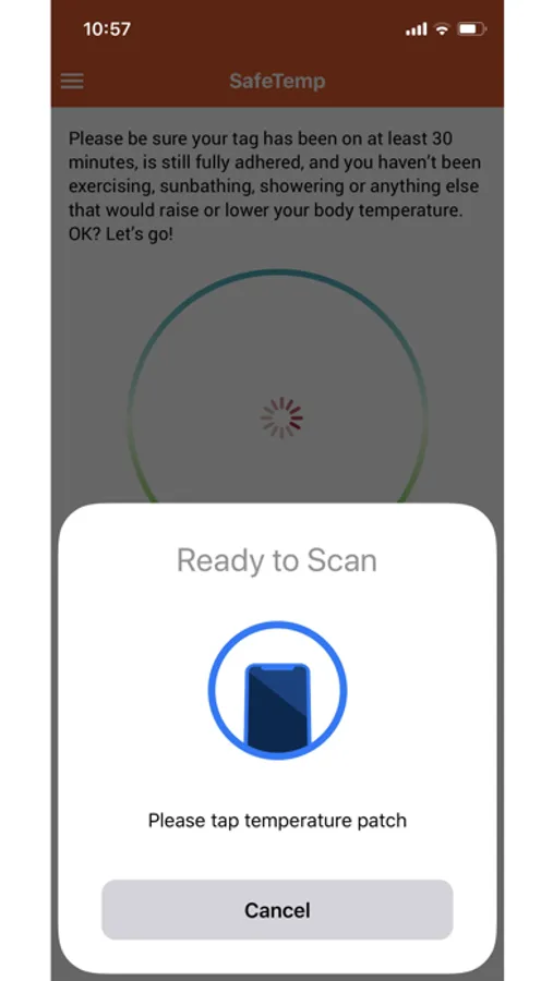 Using the SafeTemp app you can scan Identiv's temperate patches by tapping your phone to the part of the patch that wraps onto the top of your arm. You can take a reading even with your clothes covering the patch. It is simple to take your temperature at any time since it is always on your body.