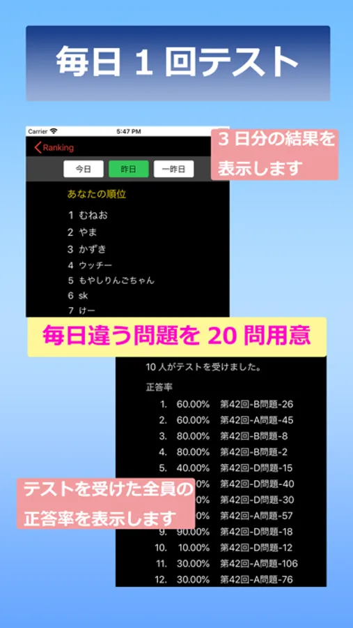 ランダムに20題出題されます。間違った問題は、あなたが現時点で確実でない範囲です。その範囲を復習してください。