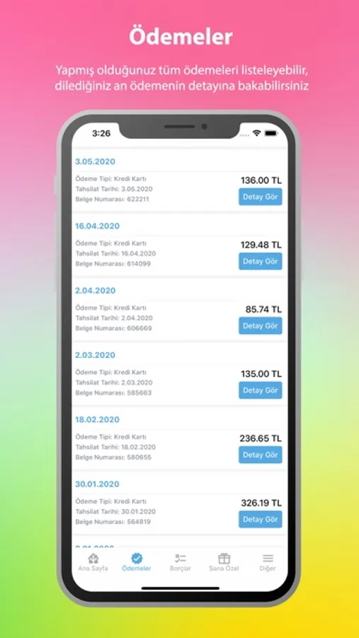 Ödemeler sekmesinde bugüne kadar yapmış olduğunuz tüm ödemelere ve detayına ulaşabilirsiniz.