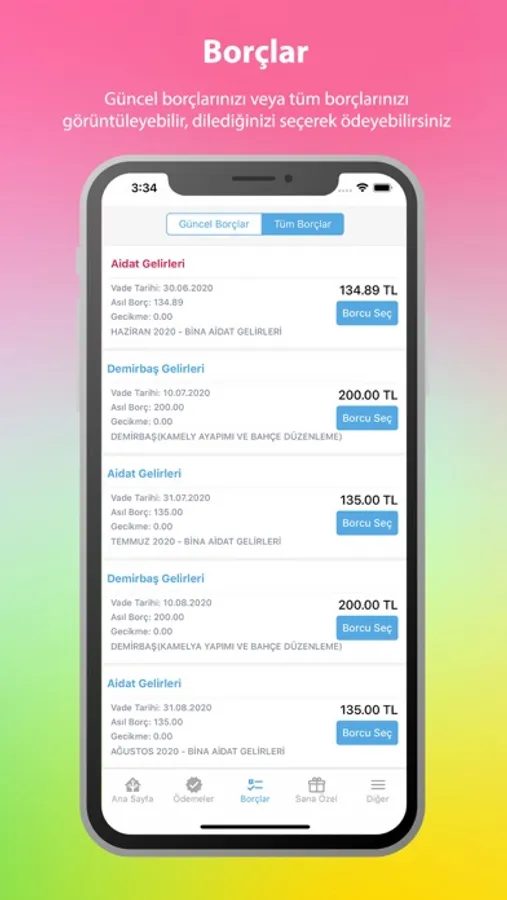 Borçlar sekmesinde güncel borçlar ve tüm borçlar olmak üzere 2 sekme bulunmaktadır. İçinde bulunduğunuz ödemeniz gereken borçlar güncel borçlar sekmesinde, carinize işlenen borçların tamamı iste tüm borçlar içinde bulunmaktadır. Dilerseniz güncel borçlardan dilerseniz tüm borçlardan seçim yaparak kredi kartınızla ödeme gerçekleştirebilirsiniz.