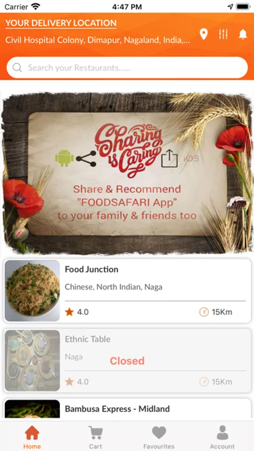 FOODSAFARI - Northeast's Food Order & Delivery App, aims in providing you a complete food ordering and delivering solution from the nearest to the best restaurants in your town/city directly till "Your Delivery Location". All you have to bear along with the Restaurant's bill is the "Shipping Charge" amount which will be calculated in accordance to the distance from the Restaurant till "Your Delivery Location". We give you the assurance that this "Shipping Charge" amount will wholly go to that Rider who will be at your service to deliver your order.