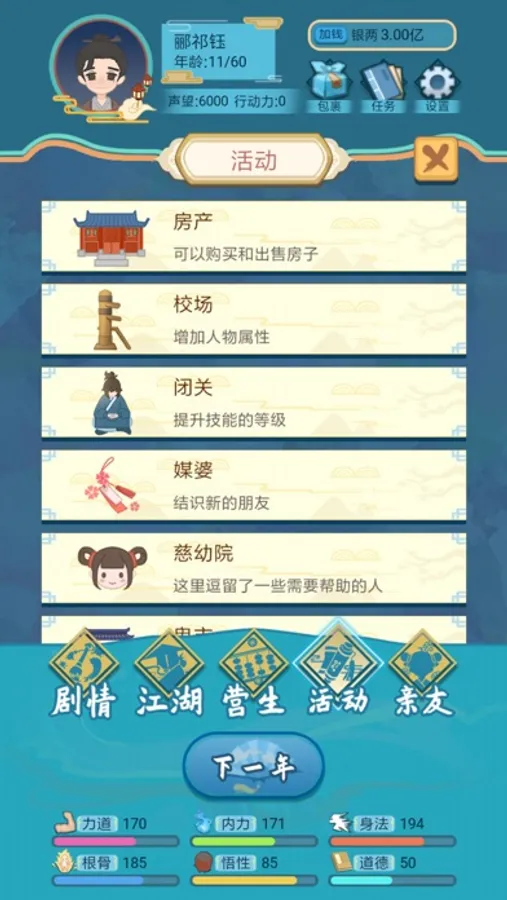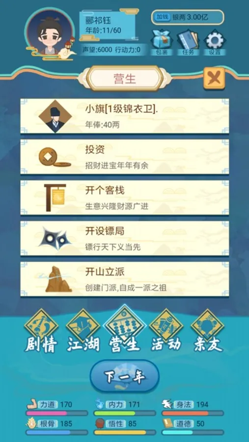 在出生之后,你可以自由选择每年要干啥,可以闯荡江湖拜师学艺,可以找个差事营生,开个镖局运镖,可以体验江湖的各种奇遇,开山立派扬名天下,也可以啥也不干家里蹲。