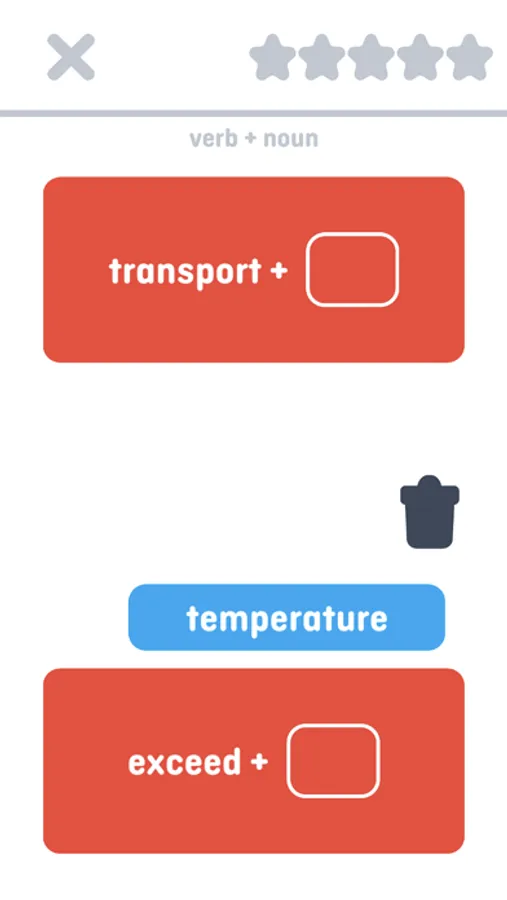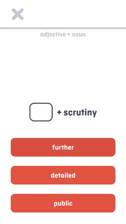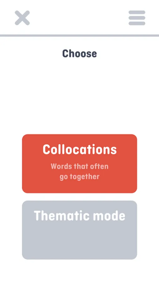 The game presents you with a word (=headword) and you need to guess a word (or words) that are most typically found with it (before or after). You can choose between the Practice mode, in which you select the level for testing, and Solo mode, where you play from level 1 onwards. There are three types of games available: Choose, Type and Drag.