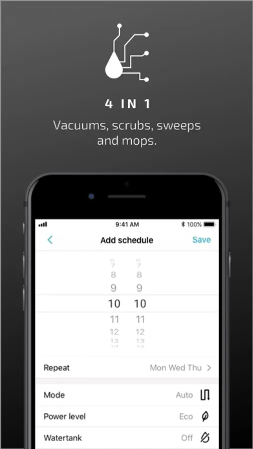 You can connect and control the robot with your Smartphone. You can choose between its different cleaning modes, the suction power, the scrubbing-mode flow level, program it once or several times a day, check the battery level and the cleaning record. In addition, you can see your home's interactive map as the robot cleans.
