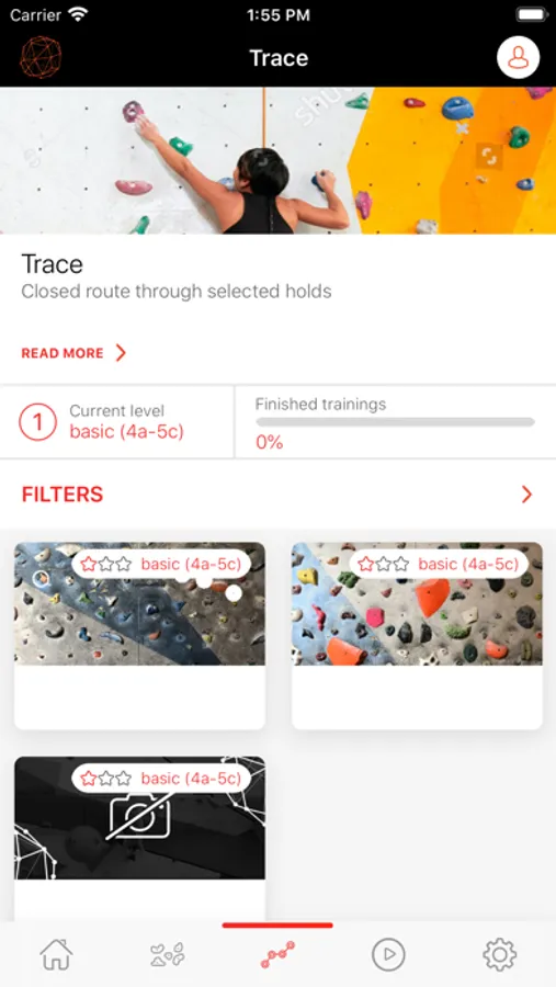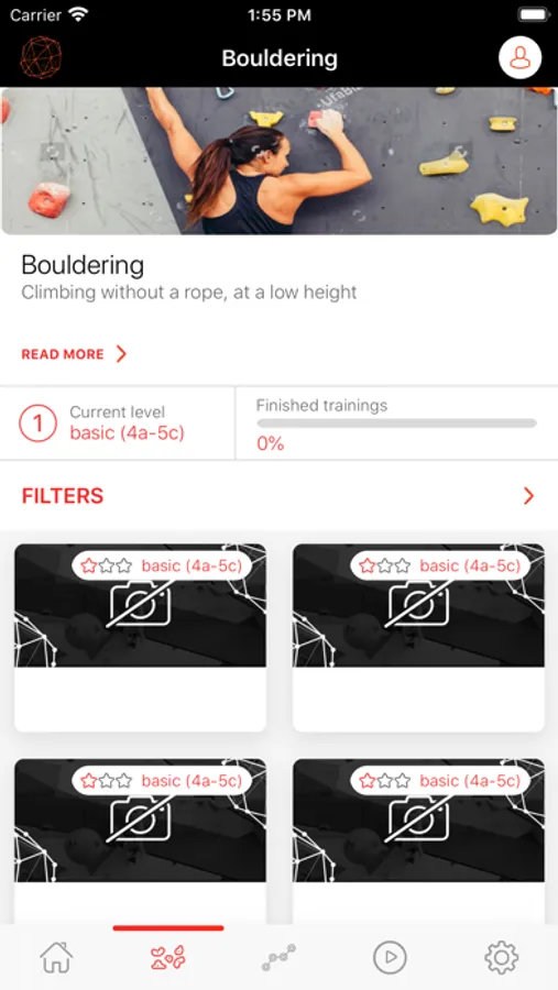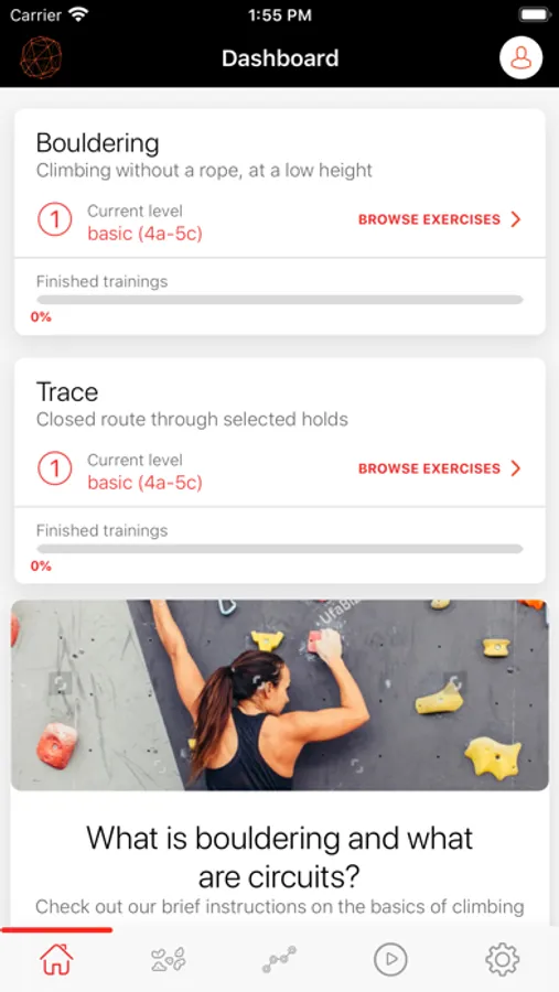 The "Rayaction Climbing" app includes sets of interactive climbing exercises divided into bouldering and routes for beginners and advanced climbing enthusiasts.