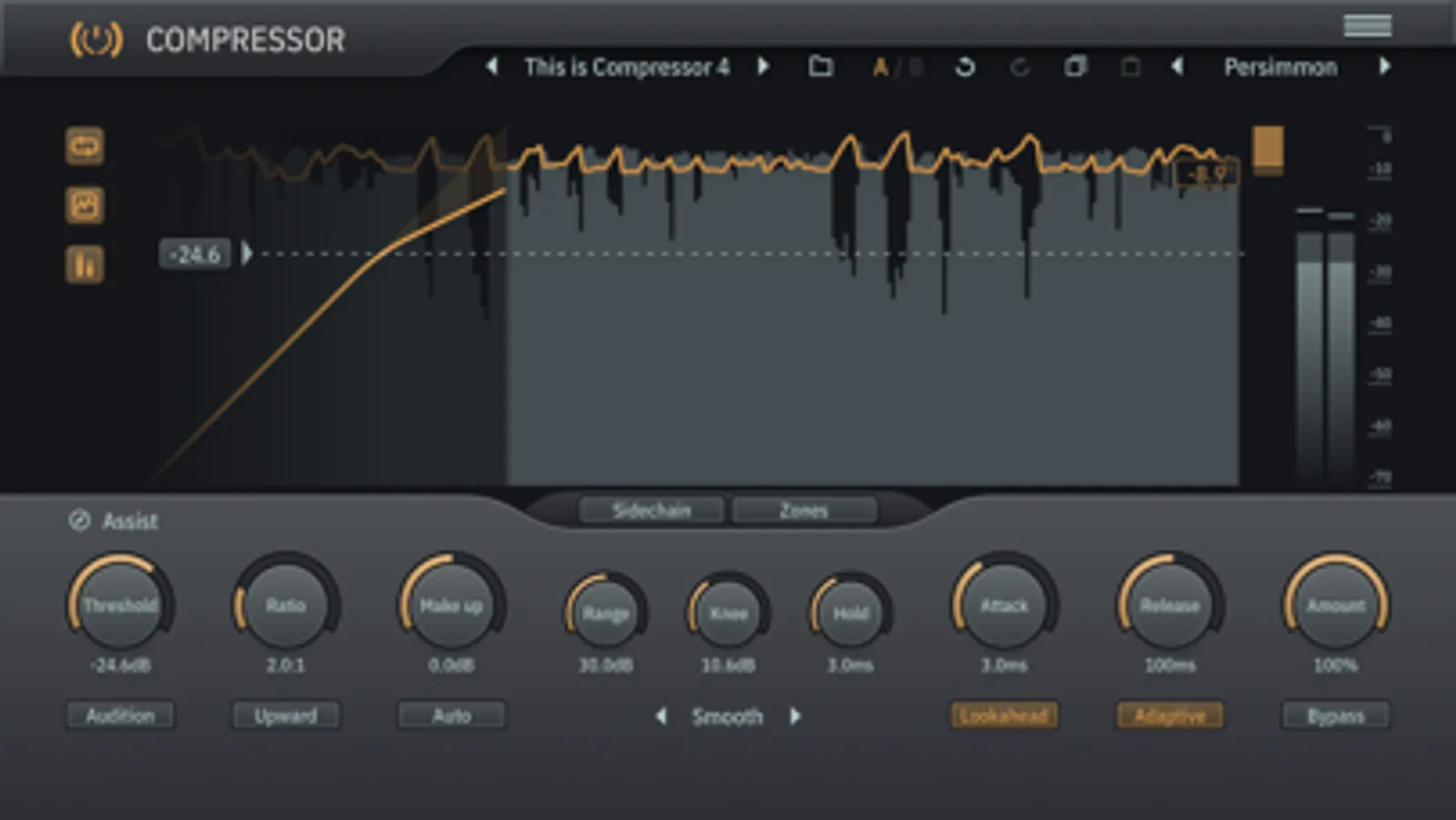 The user interface shows compression in action, with a real-time and interactive display of levels, gains and curves. Assisted sliders provide guidance to accurately adjust threshold, makeup and range parameters.