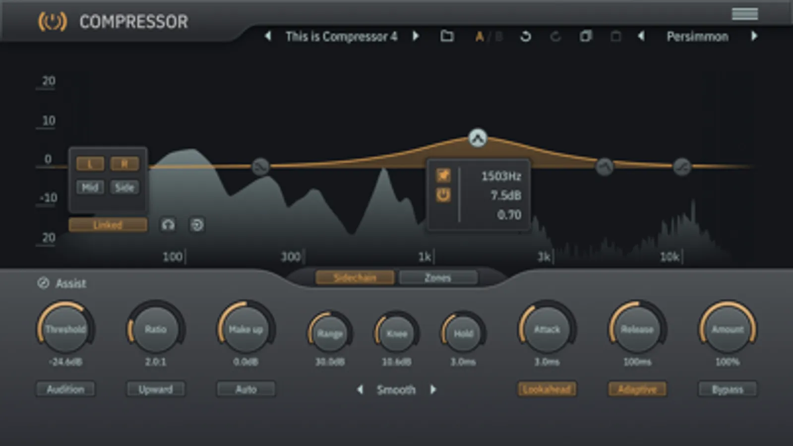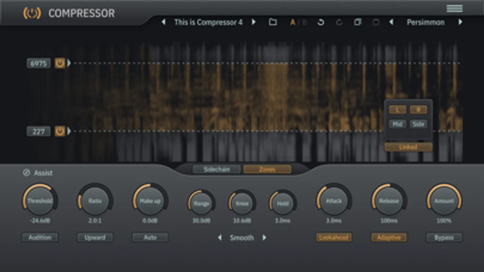 Imagine you could just compress the mid or side channel, and apply compression to a specific frequency range only. Dynamically make space for elements without having to compress the full mix; de-ess those sibilant vocals in the mid channel; soothe those harsh frequencies; the possibilities are endless. This is all possible with the compression zone feature.
