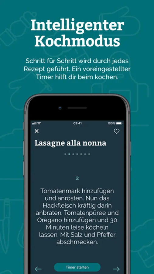 Der praktische Kochmodus führt dich Schritt für Schritt durch das Rezept, sodass du dich genau auf den Teil konzentrieren kannst, der gerade im Rezept am wichtigsten ist. Ein voreingestellter Timer hilft dir während dem kochen. Tippe einfach auf „Timer starten“ und führe deine nächsten Schritte im Rezept weiter durch, ohne ein Blick auf die Uhr werfen zu müssen.