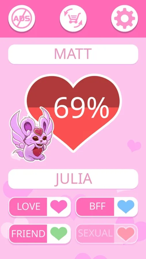 Are you in love or is it just friendship? Test your real love level thanks to LOVE TEST. Want to check other compatibilities like: friendship, Best Friend Forever, and even sexual compatibility? LOVE TEST is the calculator you need to get your answers