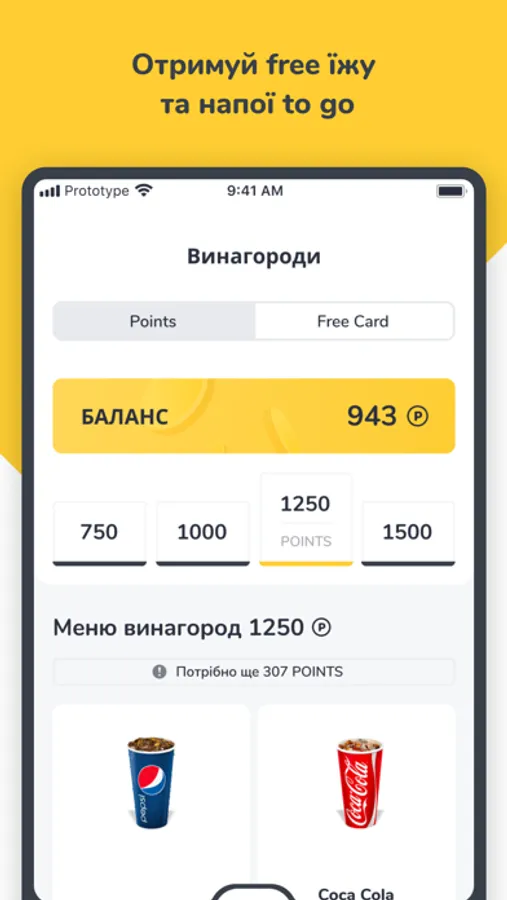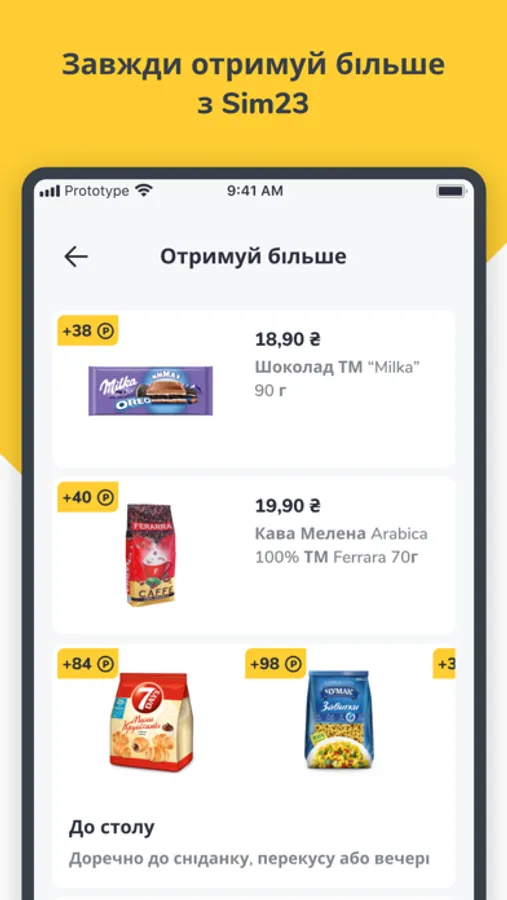 Купуй улюблені їжу та напої to go Сім23 та отримуй points за кожен придбаний продукт. Під час покупки скануй свій індивідуальний код і points автоматично зарахуються. Накопичені points обмінюй на винагороди, представлені у додатку по одному з 4-х порогів.