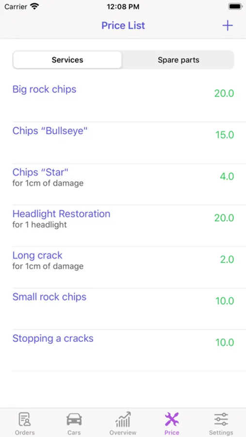* The Price-list for services. It is divided into two categories: Services and Spare parts.