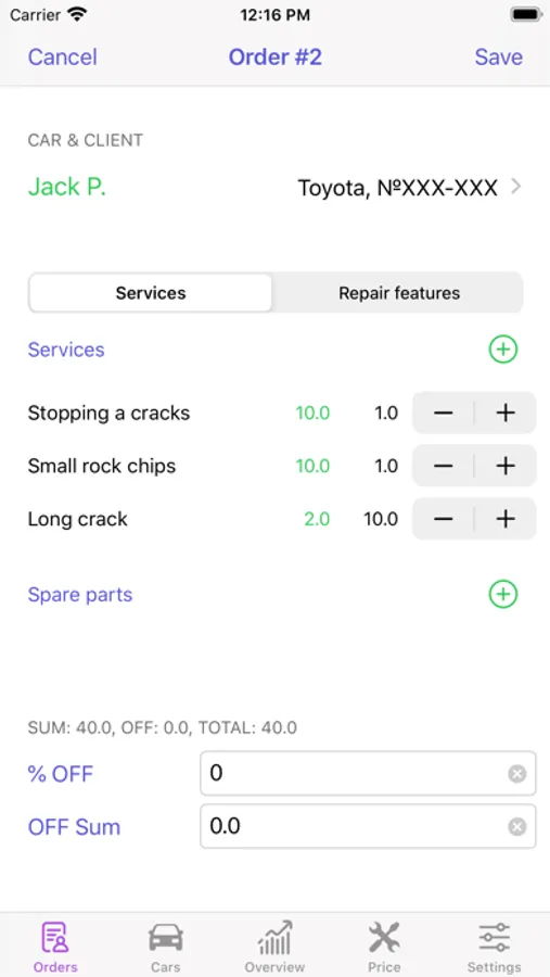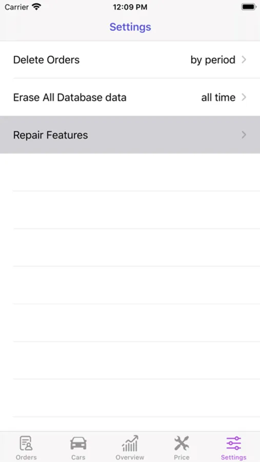 Repair features-an editable list (located in the Settings), where you can add items based on your car repair specifics.