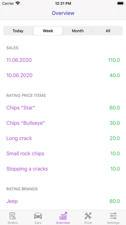 * Car Service log - a log of car service documents for periods Today/Week/Month/All. In the service Documents, you select the Price-list items for Services and Spare parts, and Repair Features of the specific Car. The mileage of the car is recorded in each document, in the car card in the list of documents for the repair of this Car, information on mileage for each document is indicated.