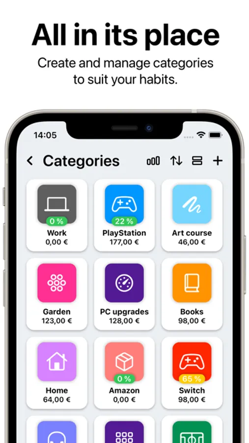 - Create groups as you like, personalize them with icons, emoji and colors. Define a limit to the group, so you can easily see the precentage you reached.
