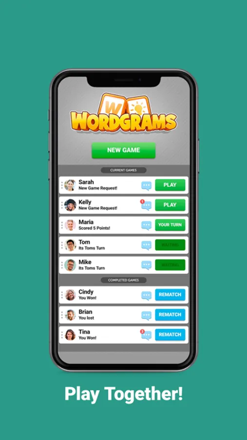 Play with friend, random opponents, or the Wordgrams friendly teacher, Sophie, for immediate games.