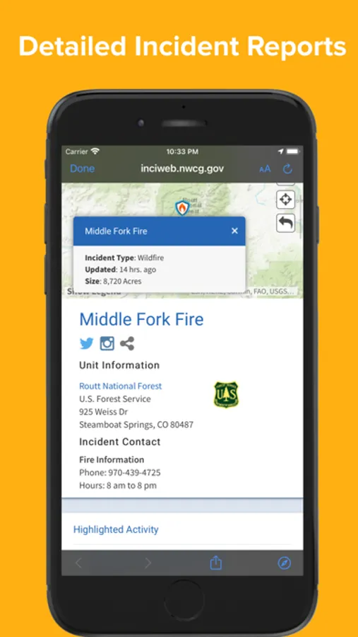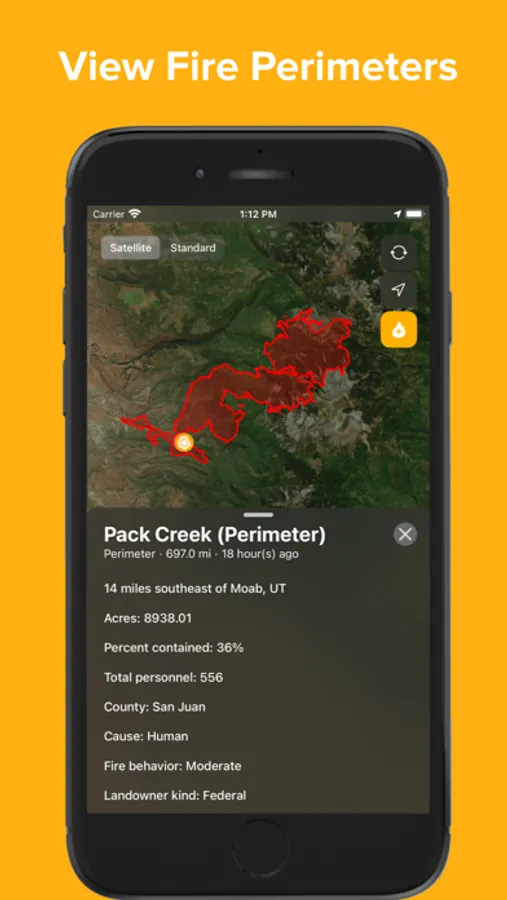 ◦ Fire perimeters - access all realtime fire perimeters at once with information about fire growth and progress, including acreage, containment, personnel, fire cause, and fire behavior