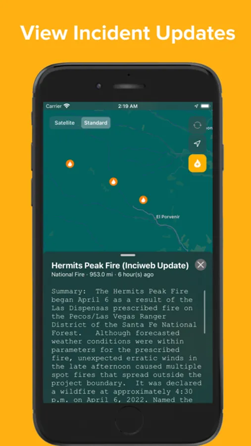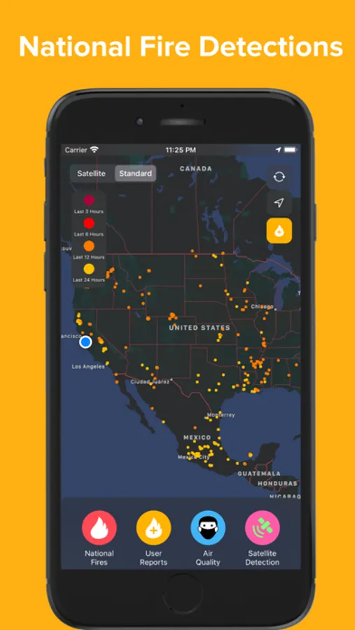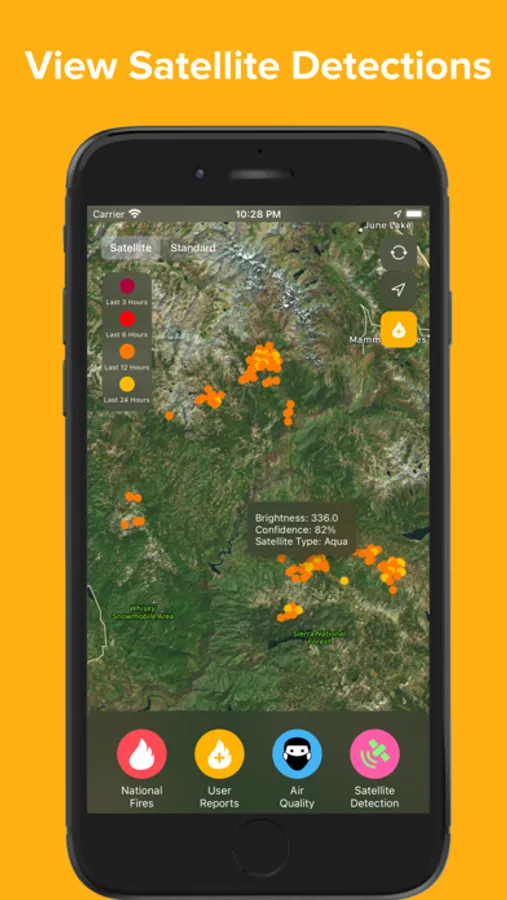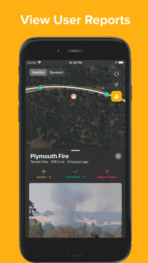 Allowing app users to report a fire and immediately inform other users is an essential aspect of Firesource. To report a fire, press the yellow + button in the top right corner of the map, select the type of fire (vehicle fire, forest fire, terrain fire, structure fire), take a photo of the fire, and press submit. To ensure the validity of fire reports, the user must take a photo of the fire and cannot access Camera Roll to select a picture. Please note that submitting a fire report automatically creates the report at the user’s location, to further ensure that the fire is local and valid. When viewing user-reported fires in the feed, other users can ‘rate’ the fire report by confirming that it is active, contained, or a spam reporting.