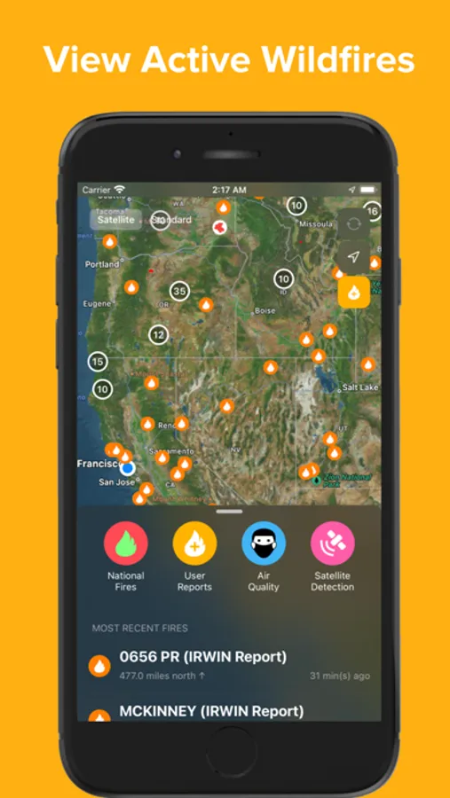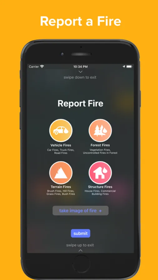 ◦ Report a fire - instantly inform other users of a nearby fire by pressing the + button, taking a picture of the fire, and submitting