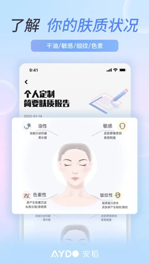 干皮/油皮/敏感皮?以前我从来不知道自己的肤质,用完安稻护肤,第一次知道皮肤的类型,还会详细说明皮肤存在的其他问题。