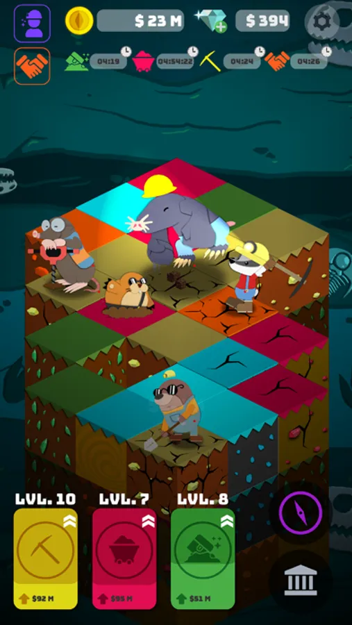Hire the moles crew and find all the minerals in the deep caves, they can help you finding all sort of artifacts and items of archeology and paleontology interest. Use your map to go even deeper.