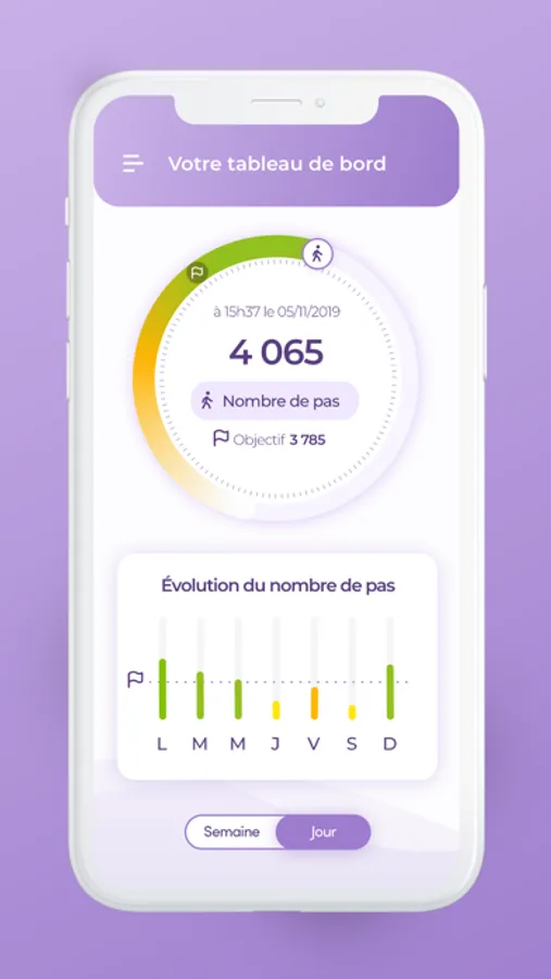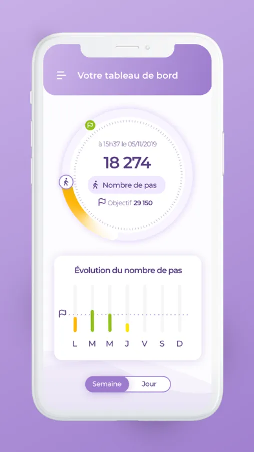 - Le dashboard (jauge de couleurs) de l’application permet de consulter sa progression par rapport à son objectif hebdomadaire et quotidien.