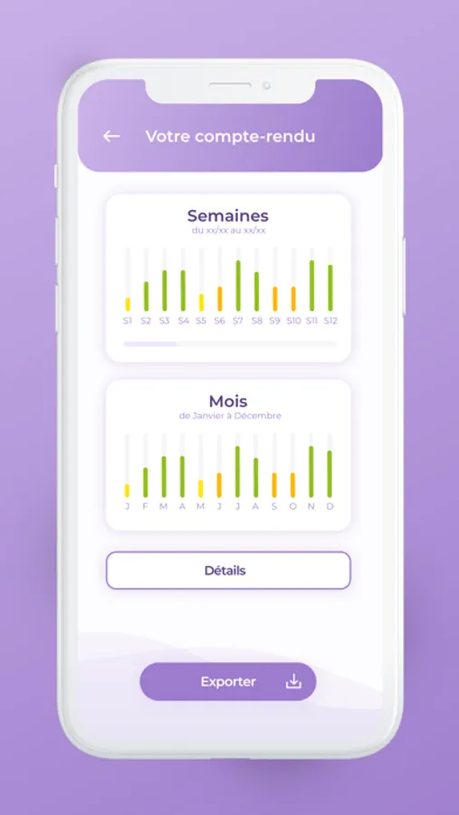 - L’application offre la possibilité de télécharger un compte-rendu, au format PDF, reprenant anonymement les données de son profil ainsi que différents graphiques (résultats d’objectif sur semaines et résultats d’objectif sur mois). Ce compte rendu anonyme peut être partagé par l’utilisateur sur un mode manuel non automatisé s’il le souhaite.