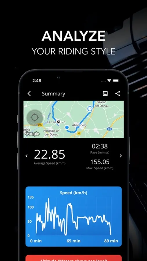 Ride With Me uses an intelligent battery saving algorithm to record routes as long as possible. Depending on the speed, the GPS sampling rate is adjusted. In addition, the app can automatically start and pause the recording using the gyroscope sensors in the phone. So you save battery during the pause!
