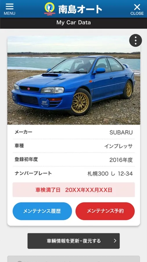 一度店舗へご来店いただきお車の登録がある場合、アプリに必要情報を入力していただくと、ご自身のお車の車検時期などがアプリ上でご確認いただけます!