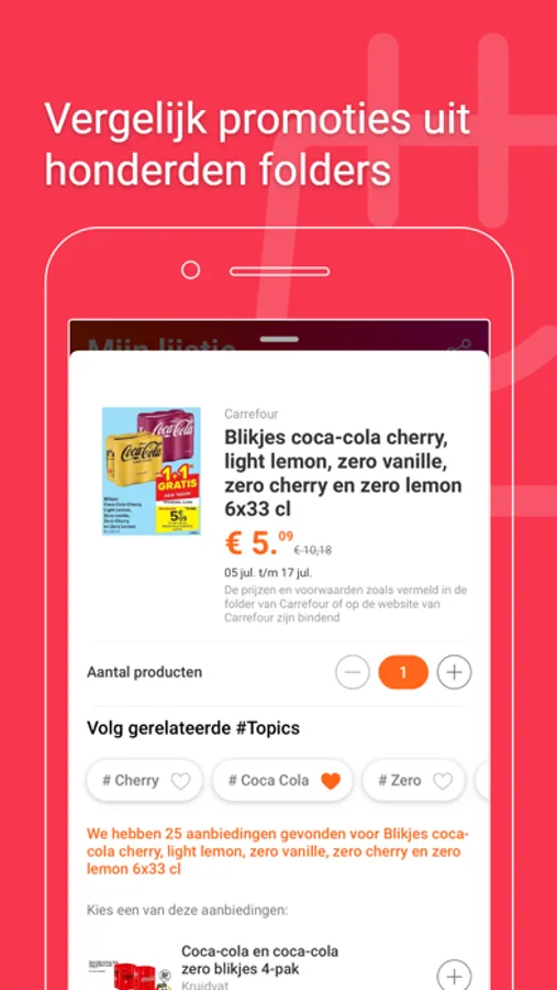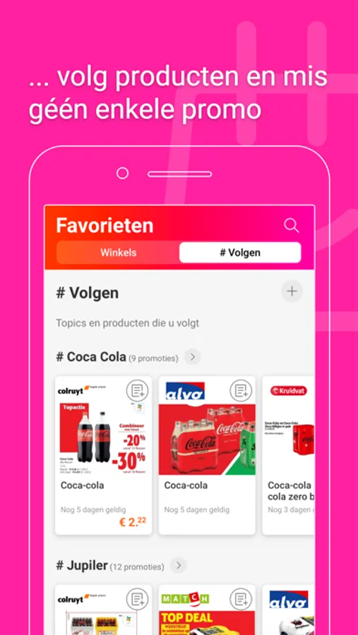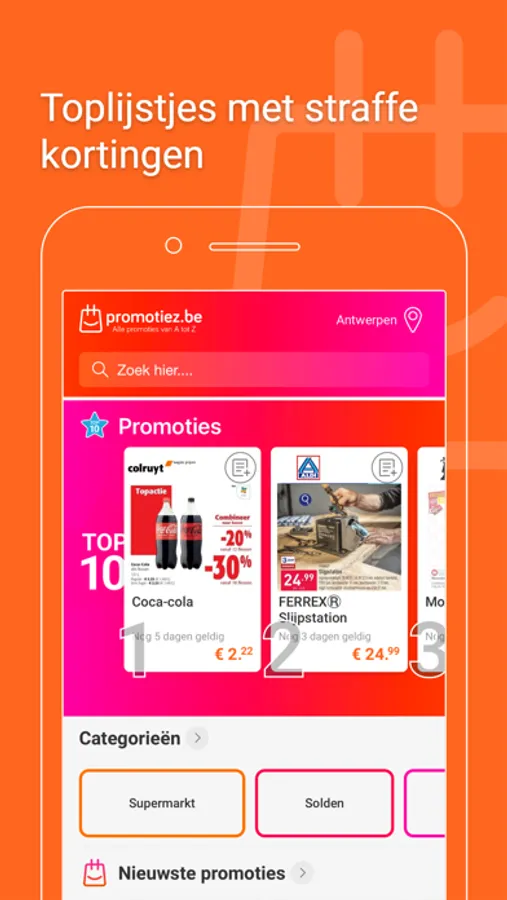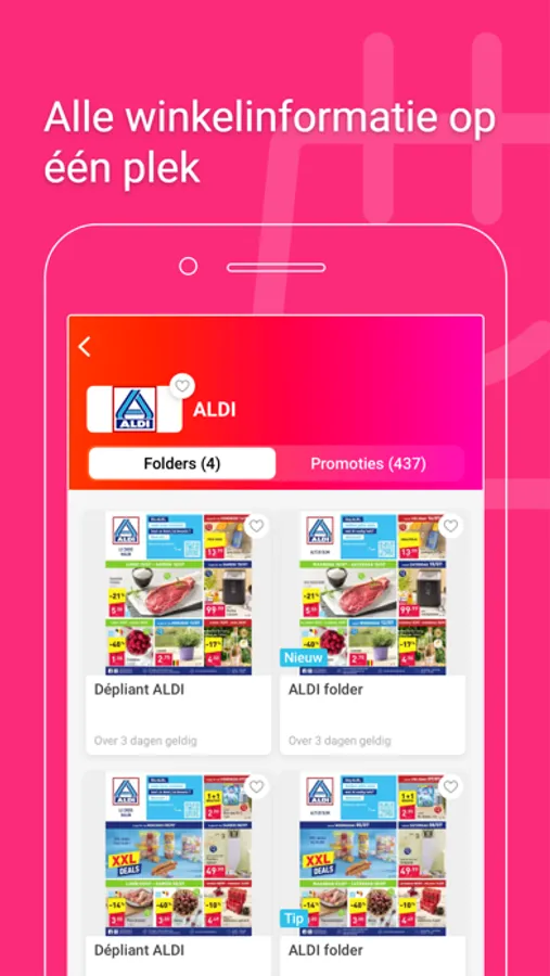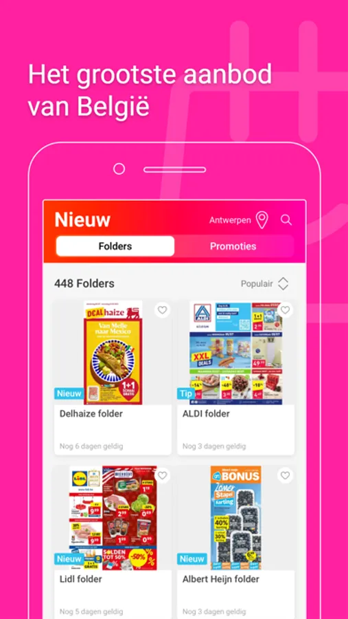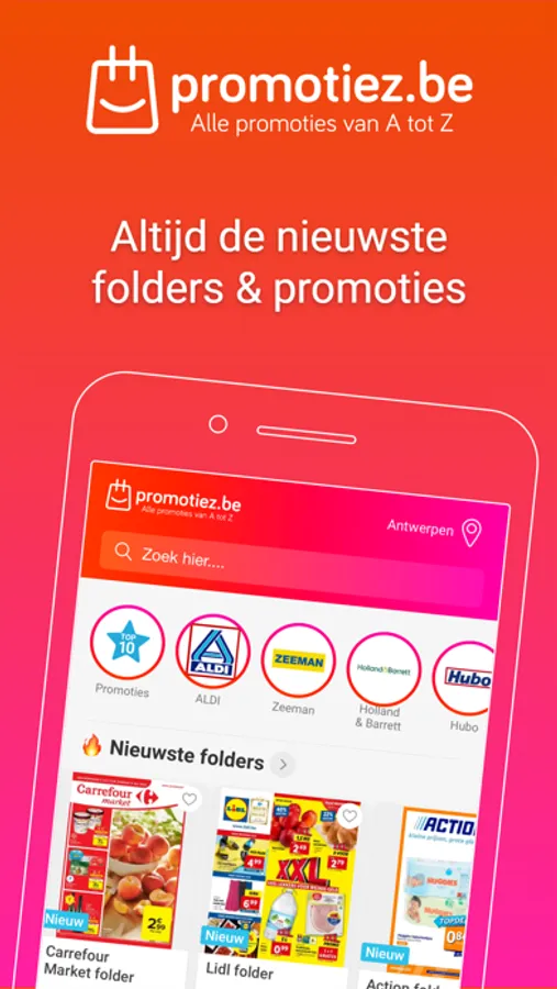 Promotiez app toont u ALLE promoties, folders en folder aanbiedingen van grote en kleine winkels in België. Niet alleen alle supermarkten en doe het-zelf-zaken, maar ook elektronicazaken, mode-, speelgoed-, computer-, en beauty winkels en nog veel meer. Zelfs lokale shops hebben we voor u vermeld. Wilt u een zaak als favoriet selecteren, dan kan dit eenvoudig door op het hartje te klikken. Hiermee bent u altijd als eerste op de hoogte van aanbiedingen van uw favoriete shops en heeft u uw favoriete reclamefolders handig bij elkaar verzameld.