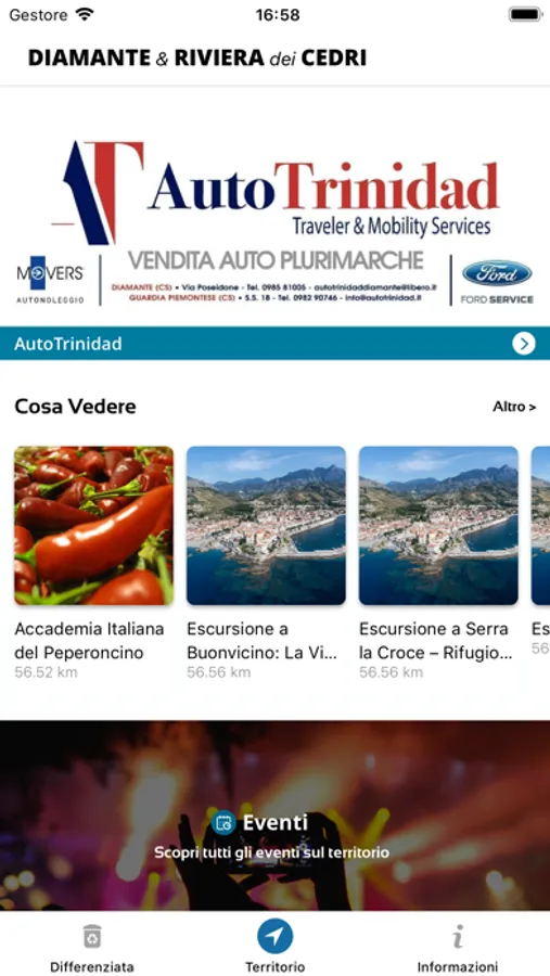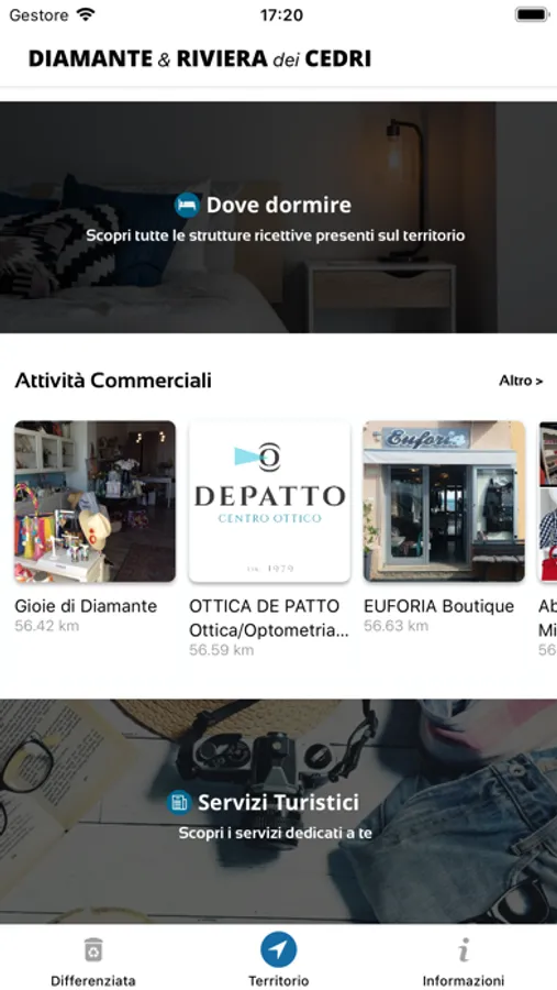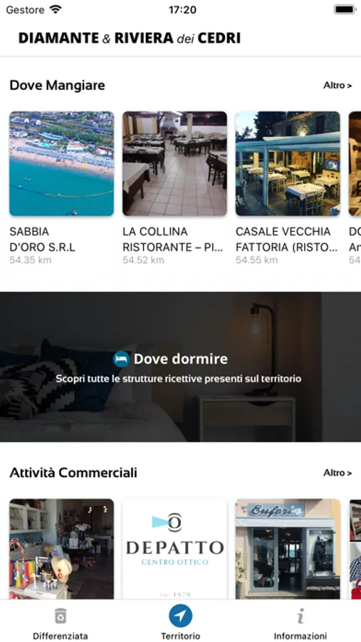• Homepage georeferenziata: suggerisce le attività commerciali disponibili nelle vicinanze (alberghi, ristoranti, ecc.), specificando per ciascuna informazioni e schede di dettaglio.
