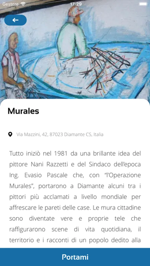 • Scheda dettaglio luoghi e eventi: mostra i luoghi della cultura nelle vicinanze dell’utente e gli eventi in programma. Per ogni elemento sono indicate tutte le info (nome, foto, descrizione, indirizzo, orari e contatti). Un pulsante consente di telefonare in tempo reale e una mini-mappa Google permette di avviare il navigatore per raggiungere luoghi ed eventi.