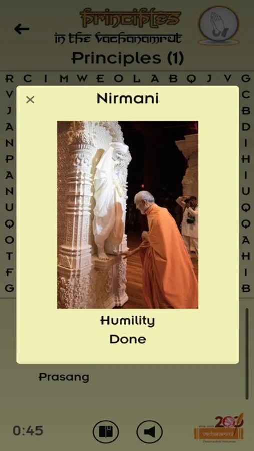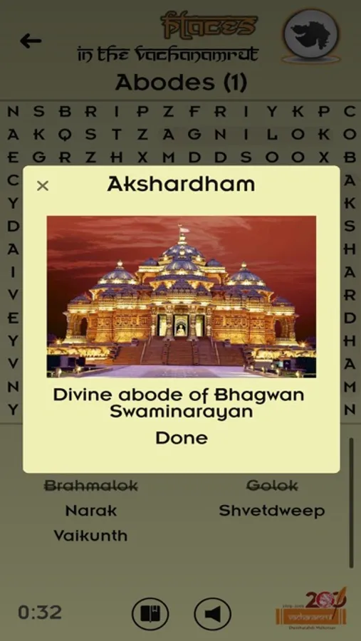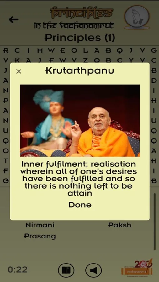 The Vachanamrut is the principal scripture of the Swaminarayan Sampraday. It is a compilation of 273 spiritual discourses delivered by Bhagwan Swaminarayan from 1819 to 1829. Through sermons and question-answer sessions, Bhagwan Swaminarayan provides practical and enlightening guidance on all aspects of spirituality for all spiritual aspirants. This educational game gives every player a deeper insight on various aspects of the Vachanamrut through four topics: