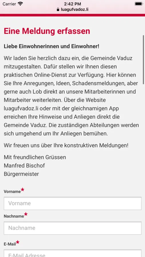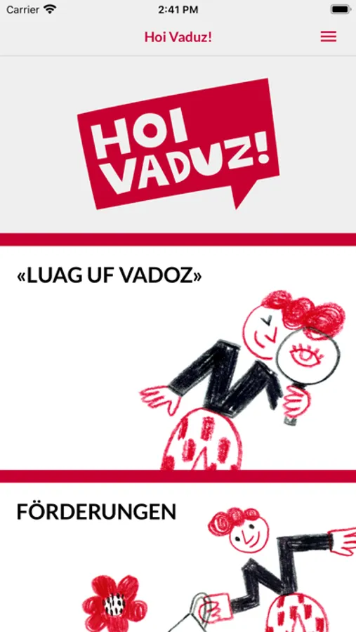 Die offizielle App der Gemeinde Vaduz für Einwohnerinnen und Einwohner. Sie wird laufend aktualisiert. Melden Sie Ihre Anregungen, Ideen, Schadensmeldungen oder auch Lob mit dem «Luag uf Vadoz»-Online-Dienst direkt an die zuständigen Abteilungen. Abonnieren Sie die Push-Meldungen um auf dem neusten Stand zu bleiben. Entwickelt und publiziert von der Cavelti AG für die Gemeinde Vaduz. Geprüft und freigegeben durch die Gemeinde Vaduz.