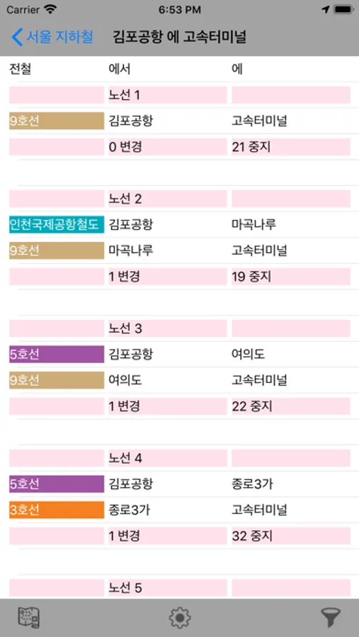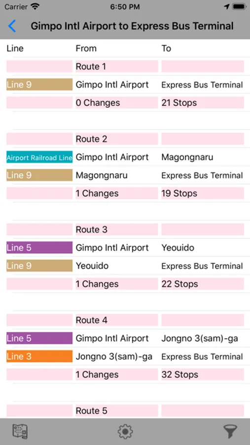 The search provides you with a list of alternative routes which can be used to travel from the source to destination station. It provides you with the number of line changes and station stops involved in each route.