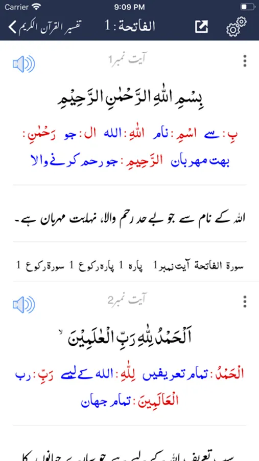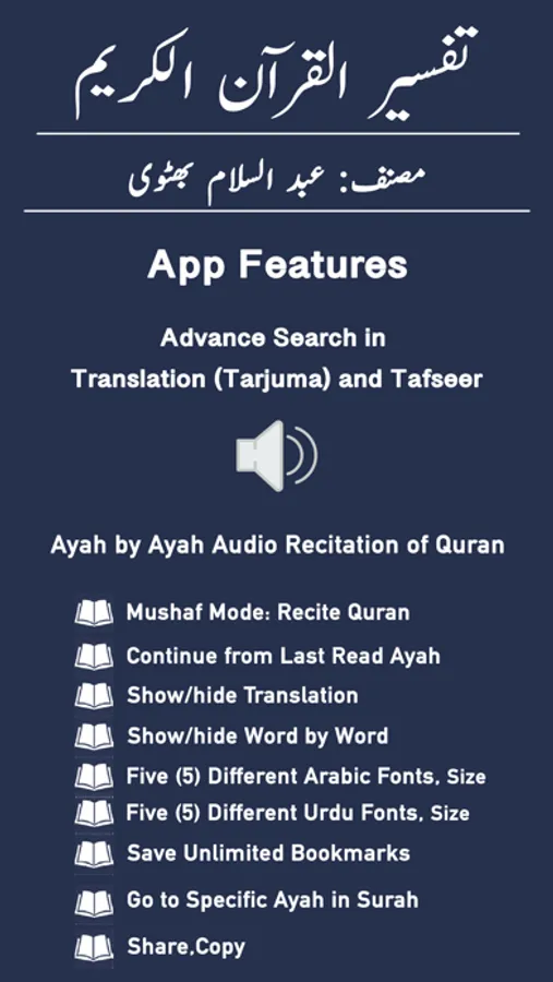 - Ability to show/hide Word by Word, Quran Translation (Tarjuma) and Tafseer