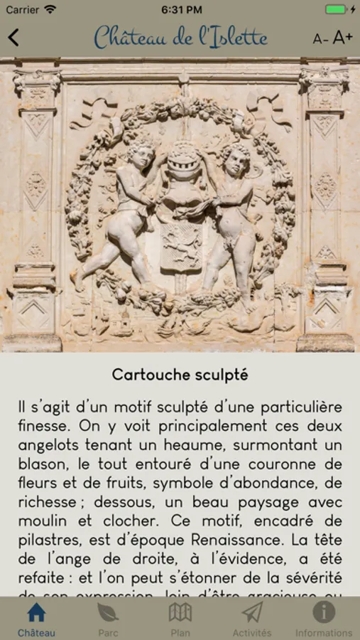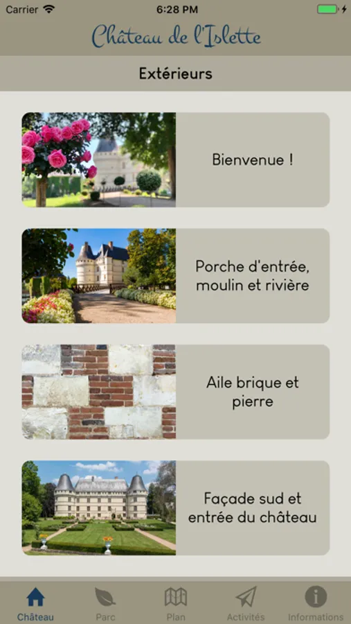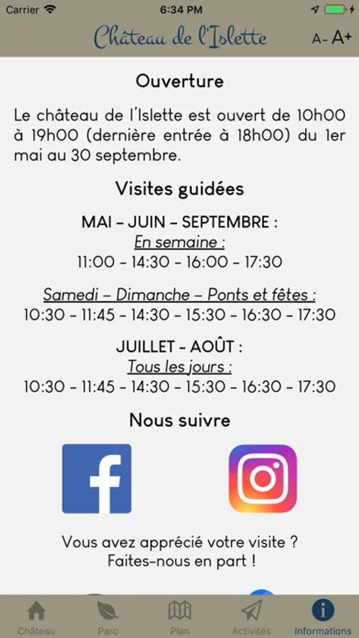 This application is an aid to the visit, you will find a lot of information on the history of the castle and on the proposed activities (picnic, boat tour, loan of disguises to children, etc).