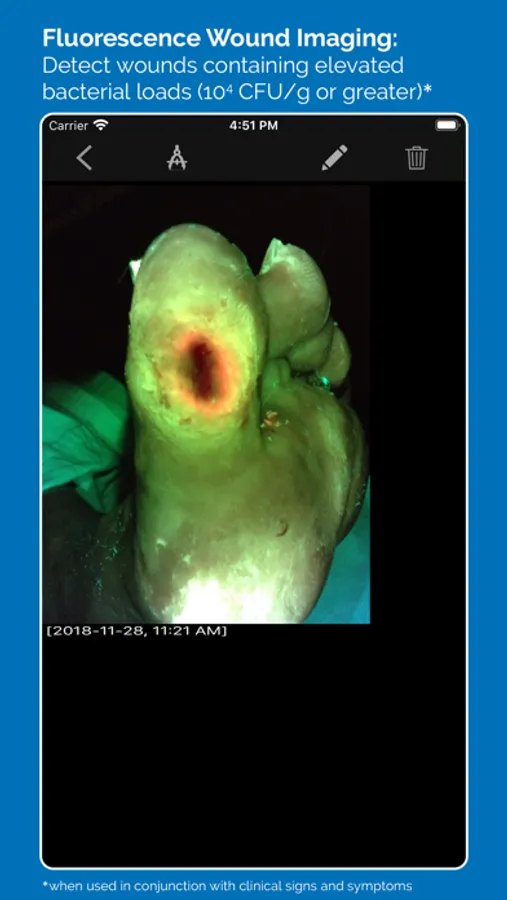The MolecuLight i:X device allows clinicians to easily capture standard and fluorescence images and videos of wounds indicating the presence of elevated bacterial burden (>10^4 CFU/g). The wound measurement functionality allows users to accurately measure wound area, length, and width.