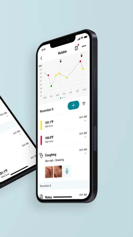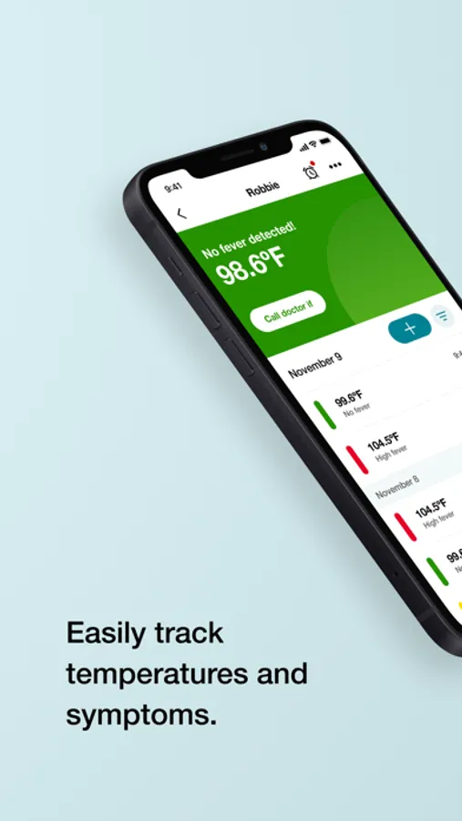 - Keep track of temperatures, medication intakes and symptoms in a convenient timeline format