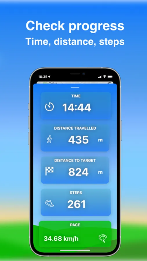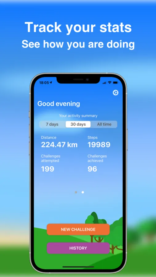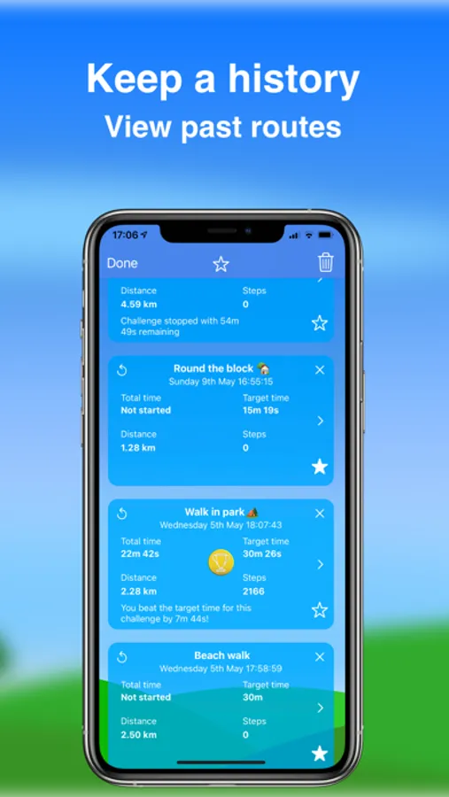 Each attempt is recorded, including the distance, how long it took and how many steps. Look back at your stats and track your progress over time.