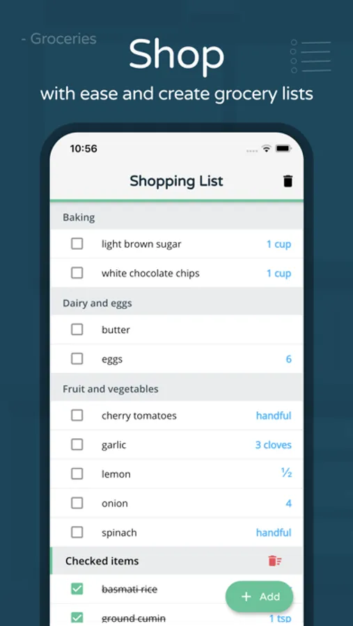 Simplify shopping with the most simple grocery list available. First, add all the ingredients from any of your recipes. Then, manually add any other items you need and let Stashcook organize them by supermarket aisle. Never again will you forget the milk!