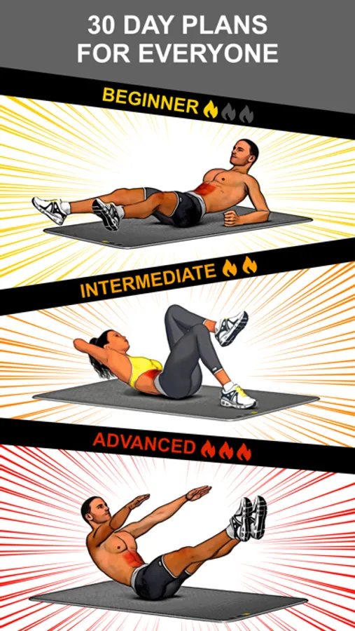 Within this FREE Fitness App you will find 3 different 30 day workout programs to help you get rid of abdominal fat, get a flat stomach, and sculpt your abs. Each day, you will get a different workout a few minutes long to keep you motivated in your weight loss and muscle toning program.