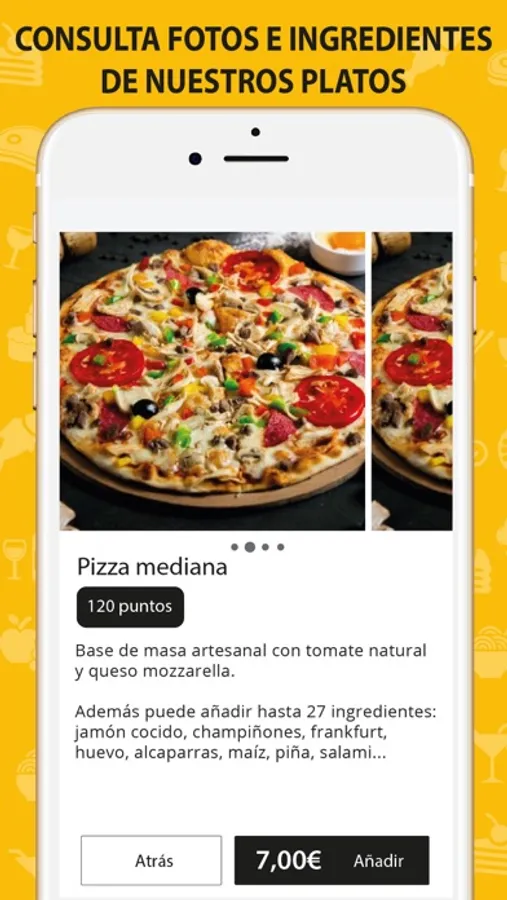 Nuestras pizzas están elaboradas artesanalmente con tomate natural y queso mozzarella. Además puede añadir hasta 27 ingredientes: jamón cocido, champiñones, frankfurt, huevo, alcaparras, maíz, piña, salami...