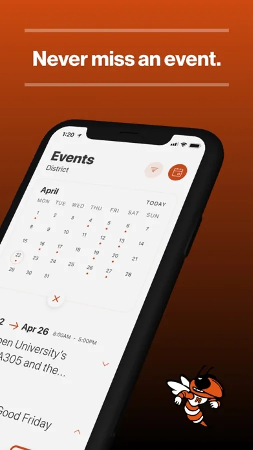The event section shows a list of events throughout the district. Users can add an event to your calendar to share the event with friends and family with one tap.