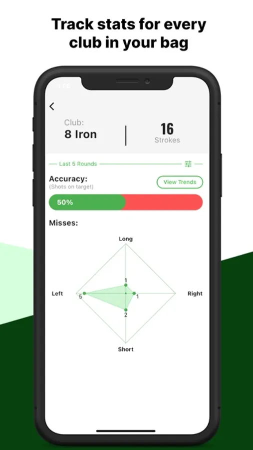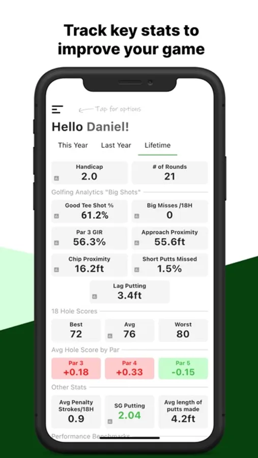 · Benchmarks key stats against various handicap levels highlight strengths/weaknesses relative to players of similar abilities.