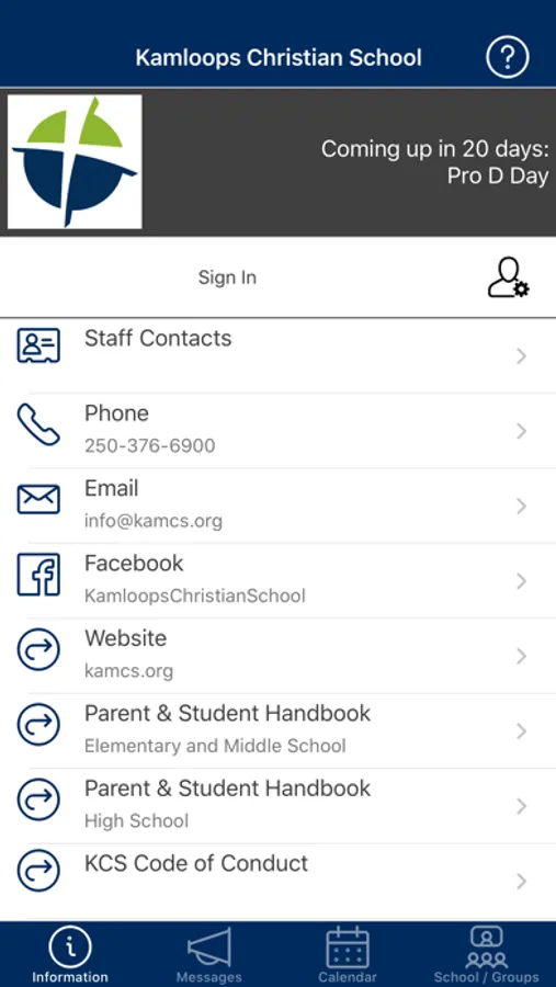 * Conveniently e-mail, phone, or navigate to the school, or reach the website or social media.