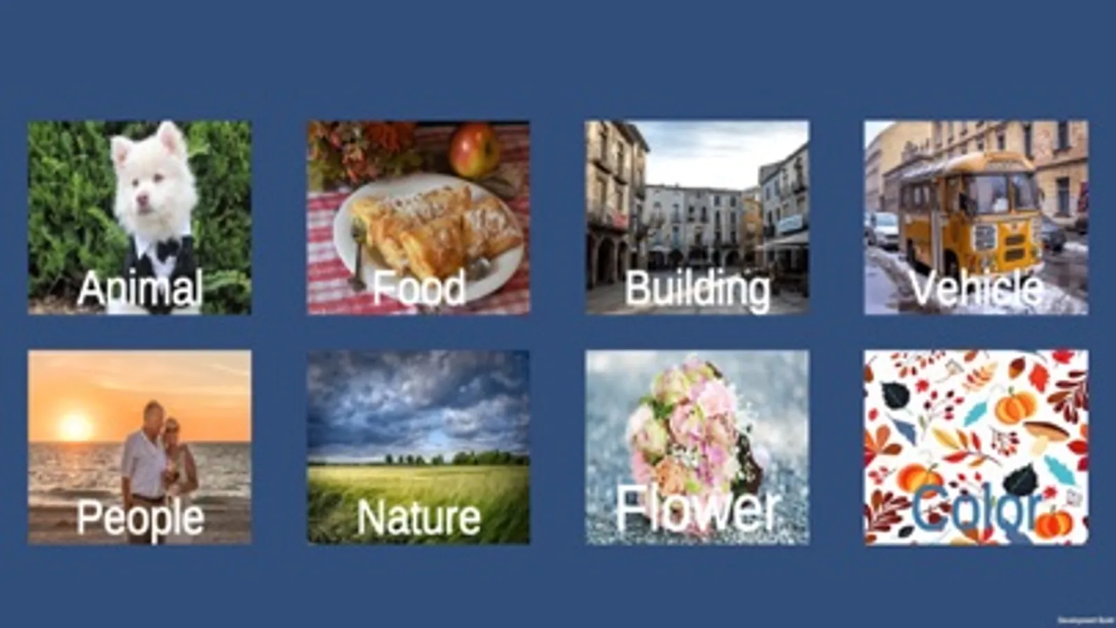 8가지 주제 (동물, 빌딩, 색상, 꽃, 음식, 자연, 사람, 탈것)