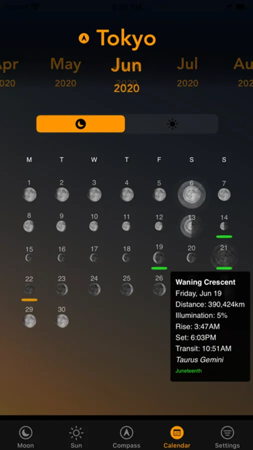 Professional Moon and Sun tracking information for your and any location around the world. All the Moon and Sun information you will need.