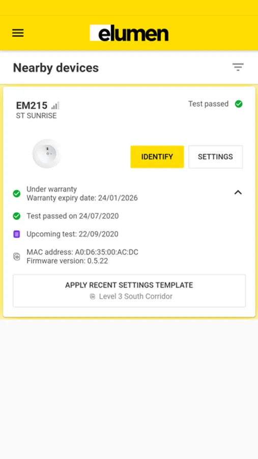 Automatic discovery of nearby devices allows you to easily configure the test schedule for your self-test emergency lights, colour temperature of your battens, motion sensor settings, and much more!