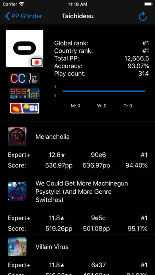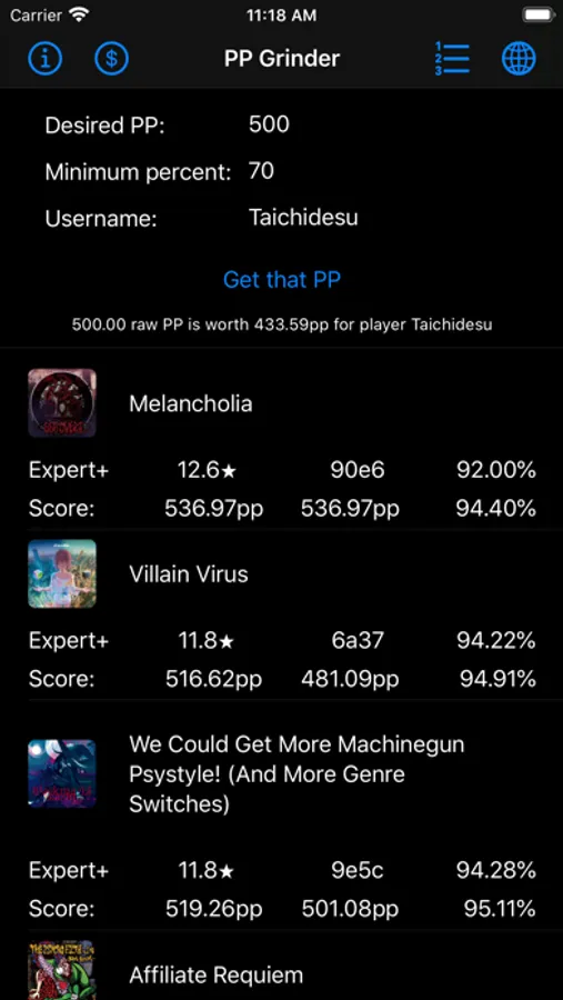 Input the amount of PP you want to earn, and the PP Grinder will tell you what scores you need to get it. The song list also shows BeatSaver song keys so you can quickly find and download the songs to Beat Saber.